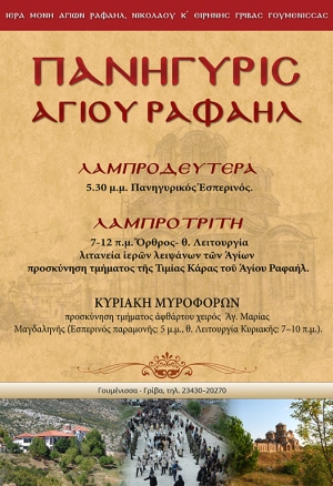 Καλώς ήλθατε στη σελίδα της Ιεράς μας Μονής που είναι αφιερωμένη στους τρεις νεοφανείς Μάρτυρες της πίστεως, τους αγίους Ραφαήλ, Νικόλαο και Ειρήνη. Οι Άγιοί μας έζησαν σύμφωνα με το θέλημα του Κυρίου και θυσιάσθηκαν με φρικτό μαρτυρικό τέλος. Η πίστη τους προς τον Χριστό αποτελούσε πυξίδα της ζωής τους και το μαρτύριό τους διατράνωσε την καλήν ομολογία και τη μαρτυρία τους. Τι κι αν πέρασαν 500 χρόνια αφάνειας και λησμονιάς; Ο Κύριος θέλησε να τους φανερώσει επάνω στη γη, υπομνηματίζοντας την παντοδυναμία Του, αλλά και τη δύναμή τους που την αντλούν απ᾽ αυτήν. Ο,τι εδίδαξε ο Κύριός μας και ο Θεός μας επαληθεύονται πλήρως με τη φανέρωση και αυτών των Αγίων, που μετά από πέντε αιώνες κάνουν αισθητή την παρουσία τους είτε “κατ᾽ όναρ”, είτε “καθ᾽ ύπαρ”, διακηρύσσοντας την αδιάφθορη και ατελεύτητη Βασιλεία Του.